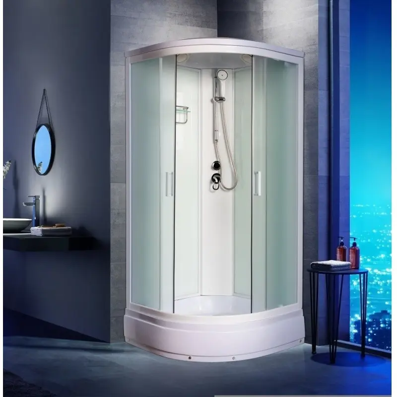 Душевая кабина Водный мир имеет размер 100х100 см. Форма — четверть круга , цвет белый, исполнение полотна двери матовое. Механизм открывания раздвижной.