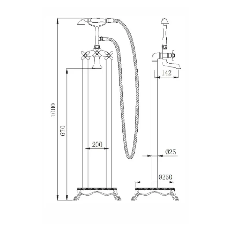 Смеситель напольный Comforty FE0051 имеет литой излив. Изготовлен из качественной латуни и имеет защитное покрытие, что способствует устойчивости к коррозии и резким перепадам температуры. Управление рычажное, напольный монтаж.